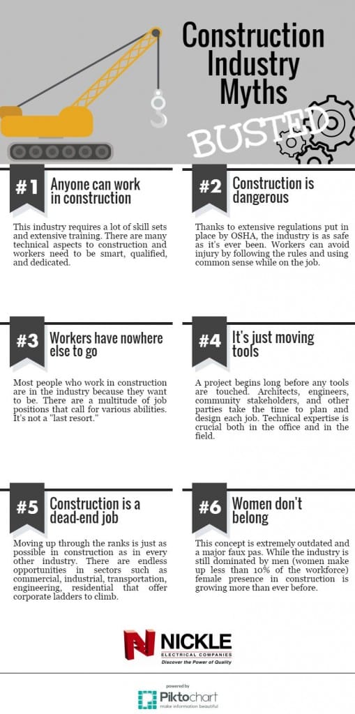 The construction industry often gets a bad reputation. Many people are misinformed about the culture and conditions in construction, believing rumors that the industry isn’t a great place work. We’ve provided a simple infographic that busts six myths of the construction industry. Can you think of any others?