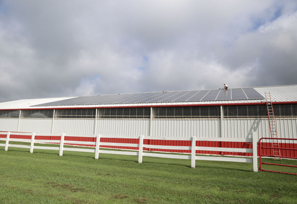 This solar project was completed at a cattle ranch, farm, and residence in Port Deposit, MD. It was the installation of 273 solar panels on the roof of an 8,000-square-foot indoor riding arena. There are 280-watt panels, seven Fronius 10,000 inverters, three subpanels, a 600-amp disconnect, and a rapid shutdown system. The 76-kilowatt grid covers 95% of the 200-acre property’s electricity usage.